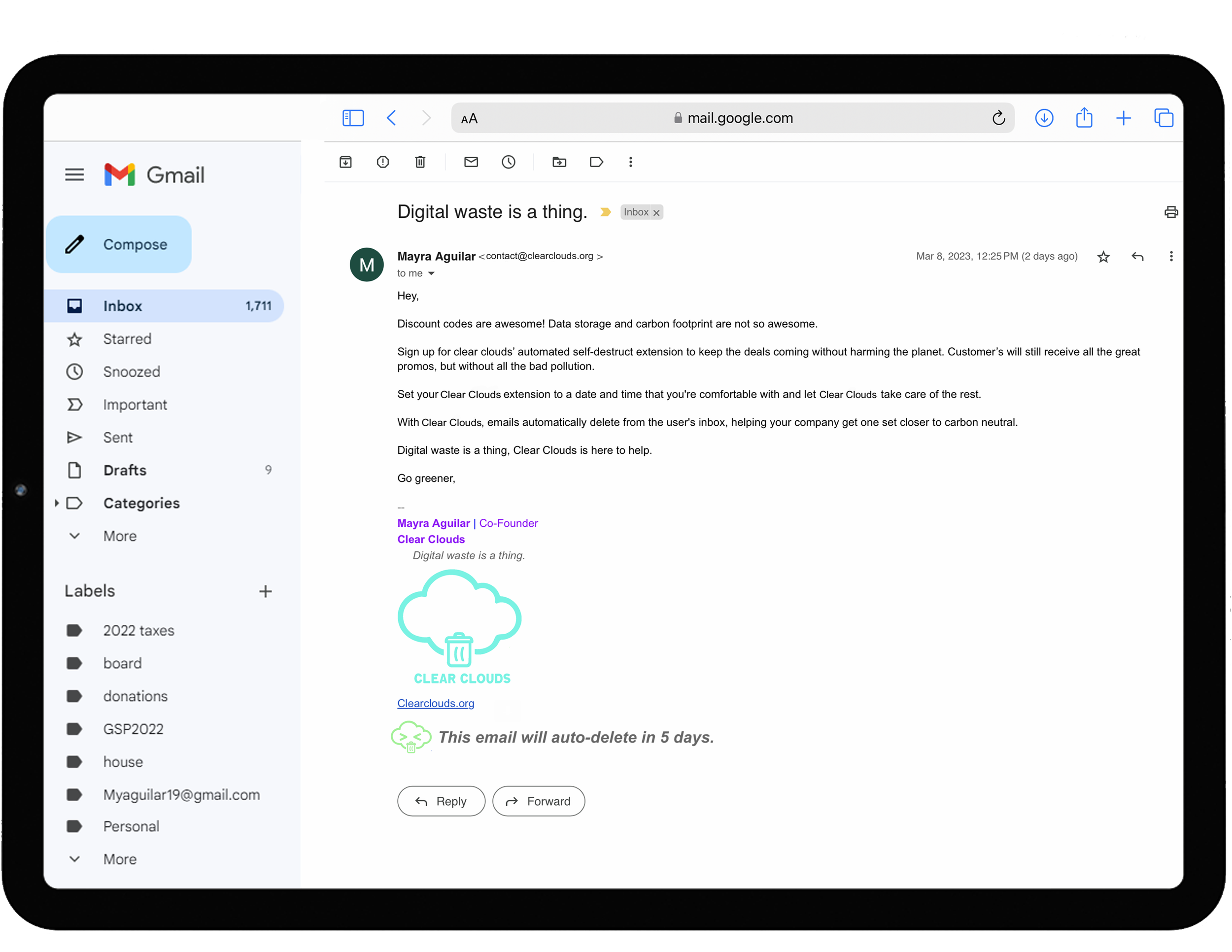 Companies who send e-blasts to consumers can now feel good about their carbon footprint. When you partner with Clear Clouds, all of your email blasts will self-delete after a designated time. It’s not just about going green, it’s about going greener. Because digital waste is a thing, and Clear Clouds is here to help.